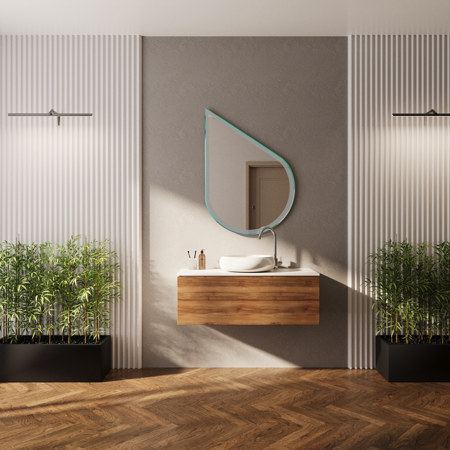 Bringen Sie sanfte Eleganz und modernes Lichtdesign in Ihr Badezimmer mit dem Gouin-3 ASM. Die tropfenähnliche Formgebung erinnert an fließendes Wasser und schafft eine beruhigende, organische Atmosphäre – perfekt für Räume, die Ruhe und Klarheit ausstrahlen sollen.