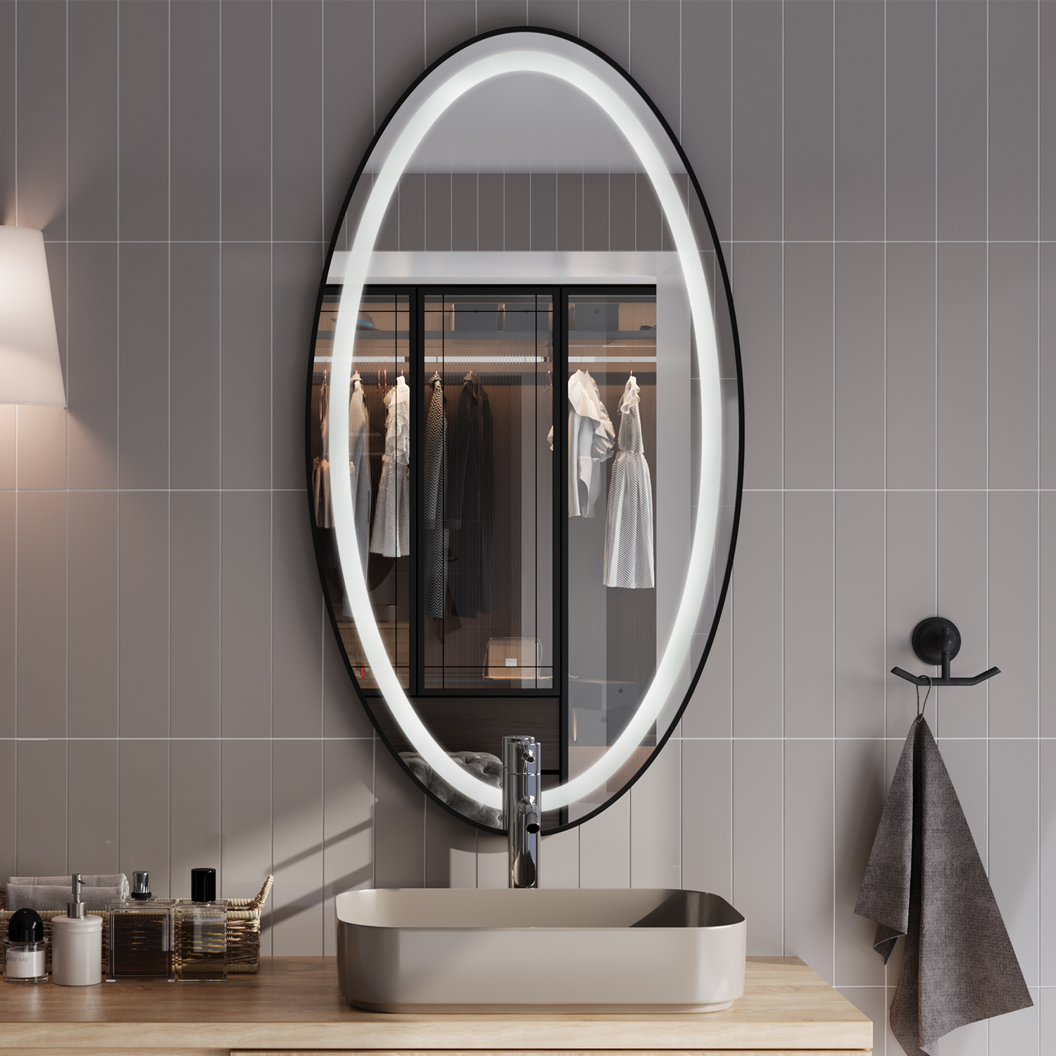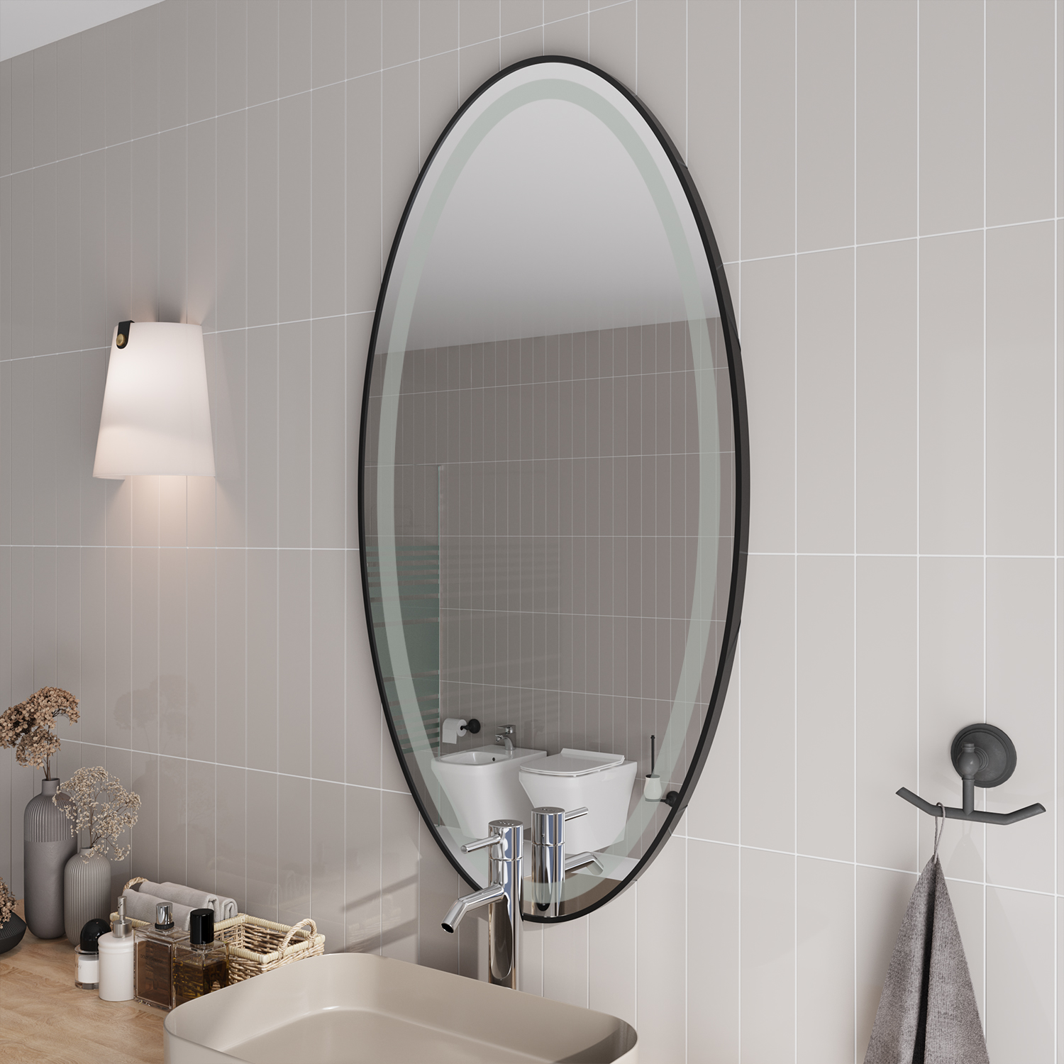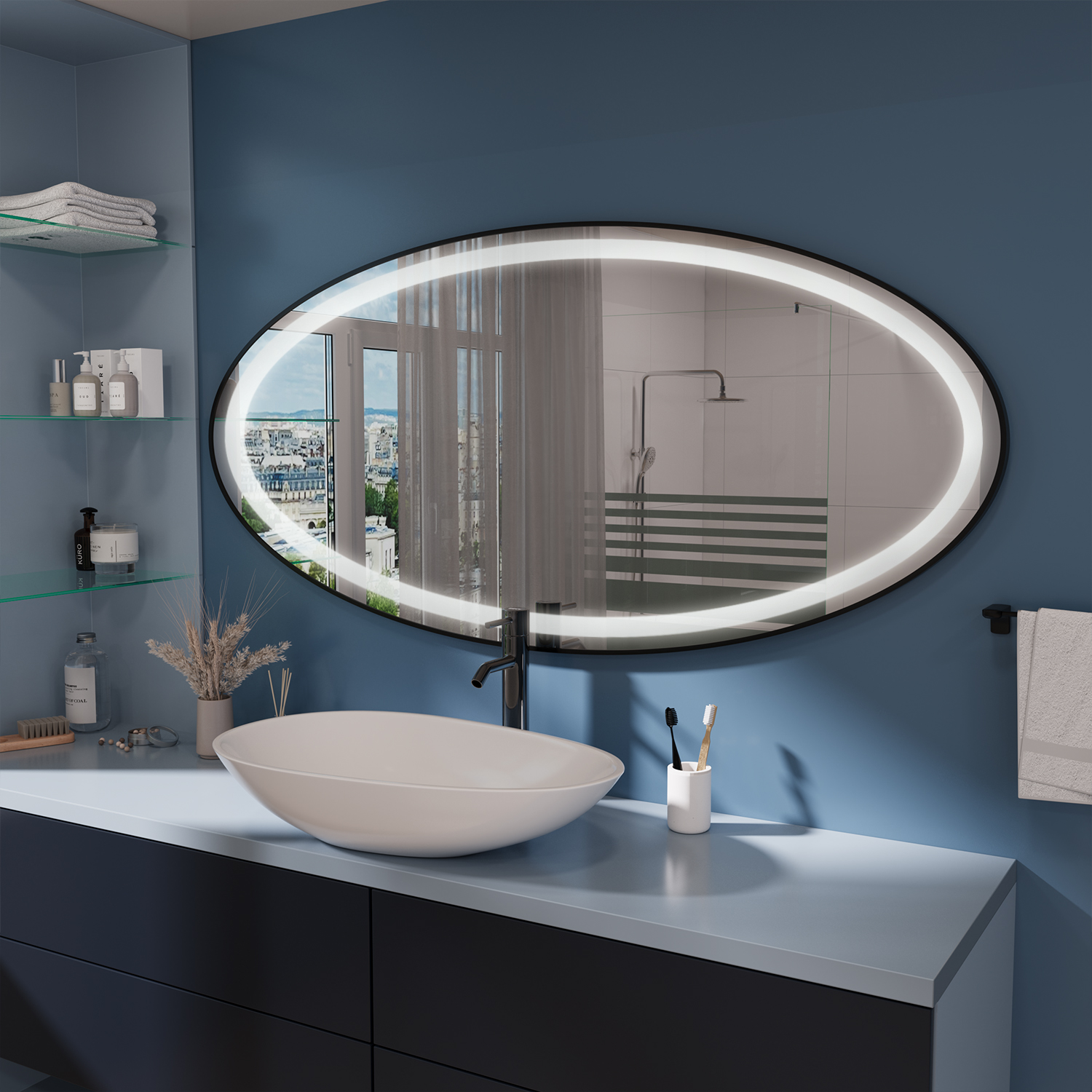 Ellyptische Wandspiegel mit schwarzen Aluminiumrahmen und LED Beleuchtung – stilvoll & modern